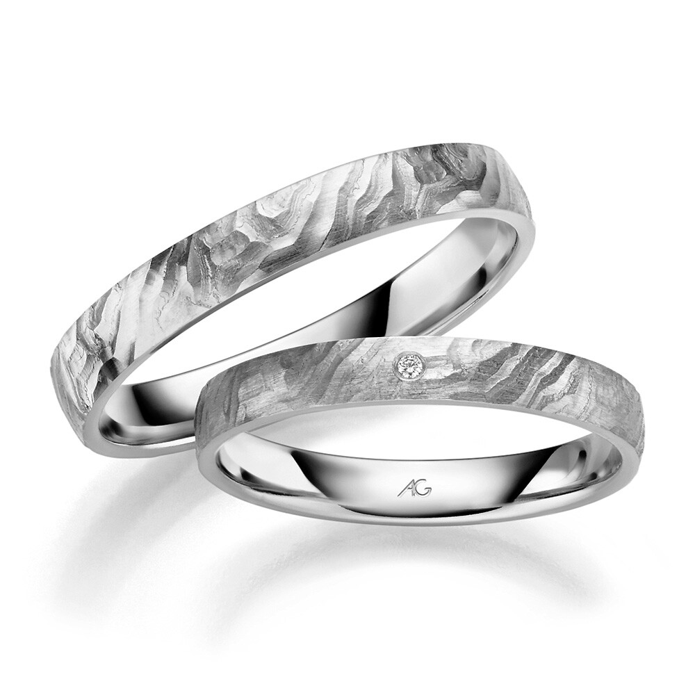 Ausgefallene Eheringevon August Gerstner aus feinem Weißgold. Der Damenring ist mit einem kleinen Diamanten mit 0.005 ct. veredelt. Für einen optimalen Tragekomfort sind die Ringe innen bombiert (abgerundet).