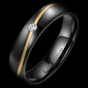 Ein schwarzer Damenring aus Black Titanium. Eine Kombination aus 49% Titan und 51% Zirkonium vereint zu einem ganz besonderen Materialgemisch. Dieser 4,5mm breiten und nur 1,8mm starke Ring ist tiefschwarz, teilweise längsmatt in Kombination mit feiner goldener Beschichtung in einer Saturnfuge! Darüber hinaus ist er mit einem weißen AAAAA-Zirkonia mit Hochglanzeffekt veredelt. Für angenehmen Tragekomfort ist der Ring innen bombiert (abgerundet).