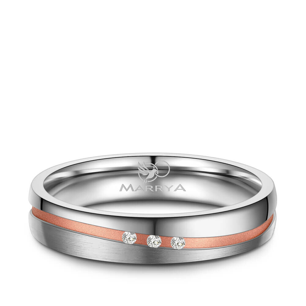 Ein Damenring aus Titan mit Rosé-Fuge und mit mehreren echten Diamanten veredelt. Die roséfarbene Fuge ist in matt gehalten. Titan ist für seine vergleichsweise hohe Kratzfestigkeit und Stabilität bekannt, trotzdem ist es relativ leicht. Zusätzlich ist der Ring von innen abgerundet (bombiert). Dies sorgt für ein besonders angenehmes Tragegefühl am Finger.