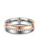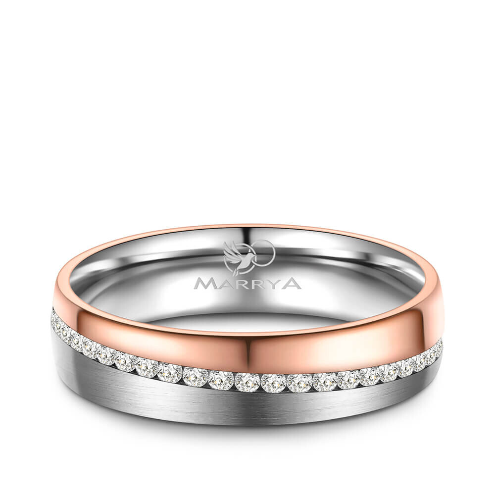 Ein Damenring aus Titan mit Roségoldplattierung. Eine Seite des Rings ist glänzend Roségold plattiert, die andere Seite ist mattiert. Titan ist für seine vergleichsweise hohe Kratzfestigkeit und Stabilität bekannt, trotzdem ist es relativ leicht. Zusätzlich ist der Ring numlaufend mit Zirkonia-Besatz veredelt und von innen abgerundet (bombiert). Dies sorgt für ein besonders angenehmes Tragegefühl am Finger.