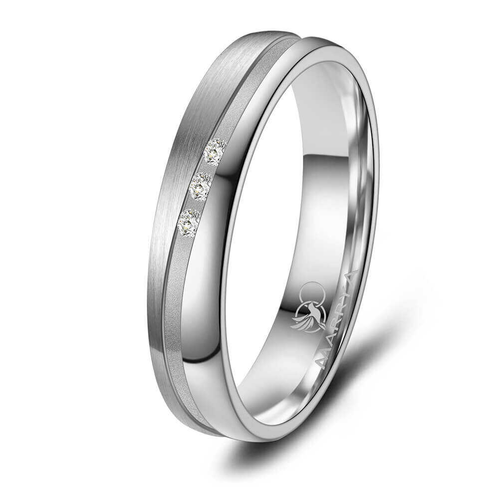 Ein wunderschöner Damenring aus robustem Titan mit geschwungener Saturnfuge. Dieser Ring zur Hälfte mattiert und zur anderen Hälfte poliert. Er ist hochwertig verarbeitet und sitzt durch seine Bombierung (an der Ringinnenseite abgerundet) sehr bequem am Finger. Darüber hinaus ist er innerhalb der Fuge mit drei echten Diamanten veredelt.