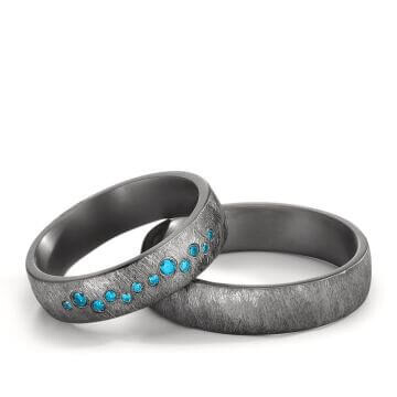 Hochwertige Eheringe aus Tantal mit gebürsteter Oberfläche. Der Damenring ist dabei mit einem funkelnden blauen Diamanten (ges. 0,104 ct.) besetzt. Beide Ringe, welche auch als Partnerringe getragen werden, sind innen bombiert und außen gerade. Das sorgt für ein angenehmen Tragegefühl. Tantal ist ein sehr kratzfestes Material welches zudem äußerst unempfindlich gegenüber Tragespuren ist. Gern gravieren wir diese Ringe mit Ihrem Wunschtext.