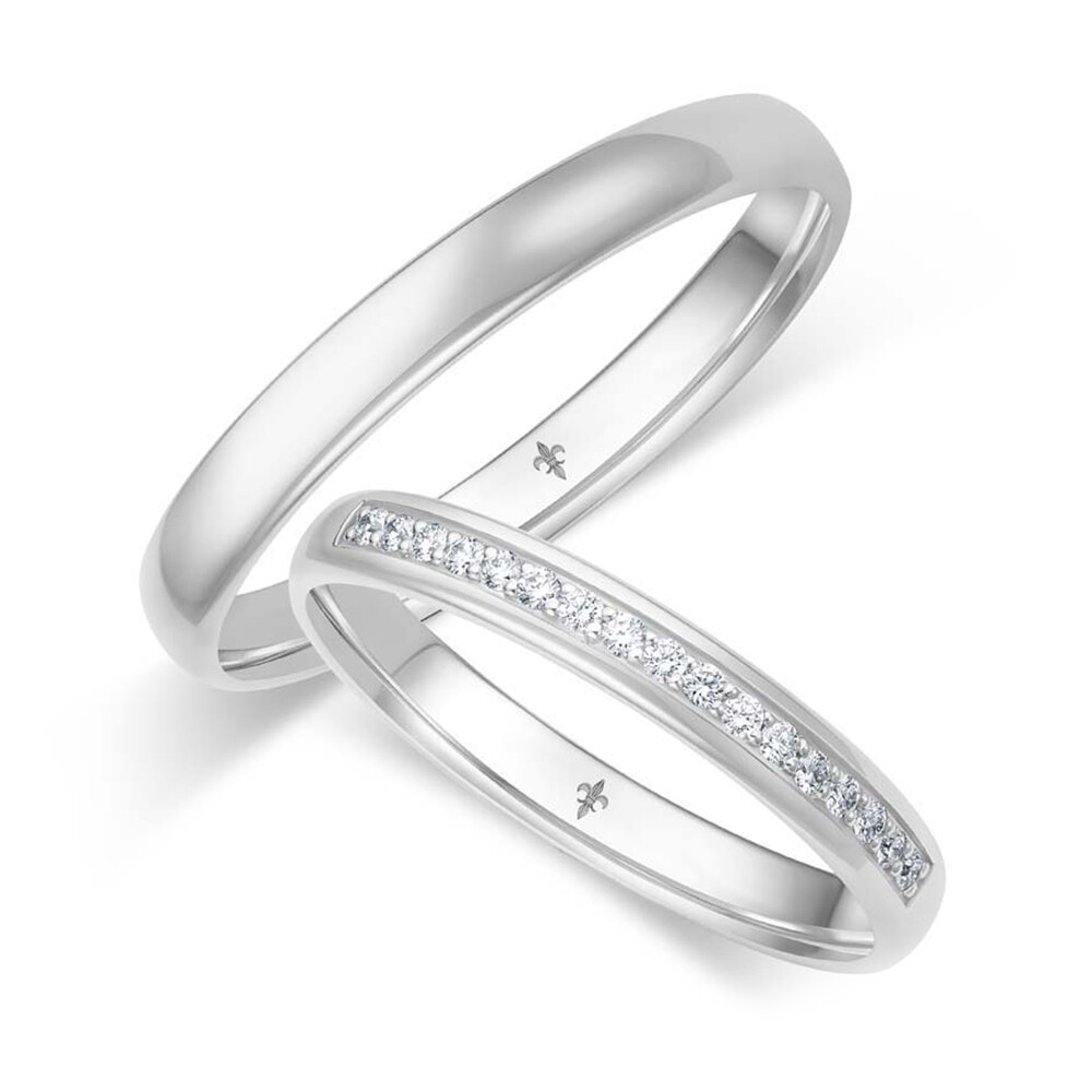 Faszinierende Trauringe und Eheringe Léa aus Weißgold mit glänzender polierter Oberfläche. Der Damenring ist mit mehreren lupenreinen Diamanten im Brillantschliff veredelt. Beide Ringe sind bombiert, für angenehmen Tragekomfort.