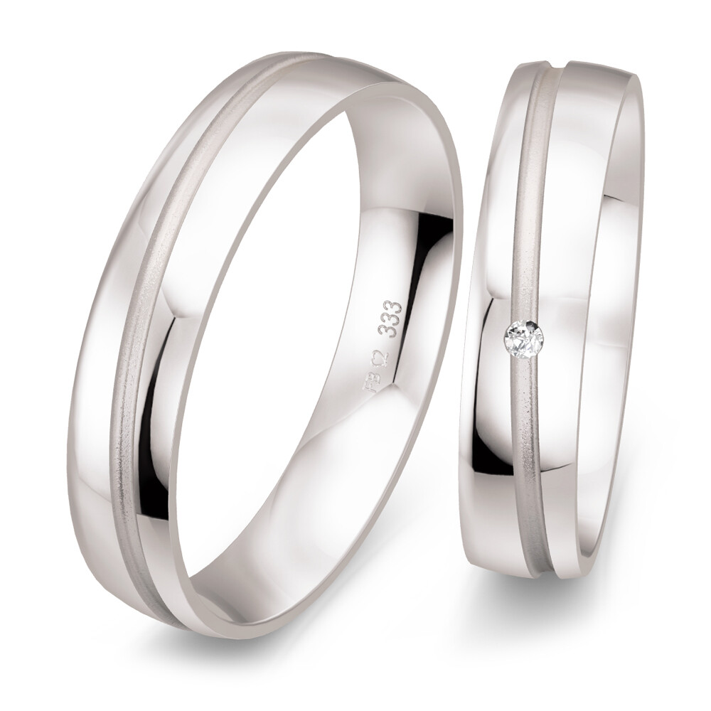 Wunderschöne hochwertige Eheringe von Breuning aus feinem Weißgold mit Saturnfuge. Mit einem strahlenden Diamanten am Damenring. Beide Ringe sind bombiert, für angenehmen Tragekomfort.