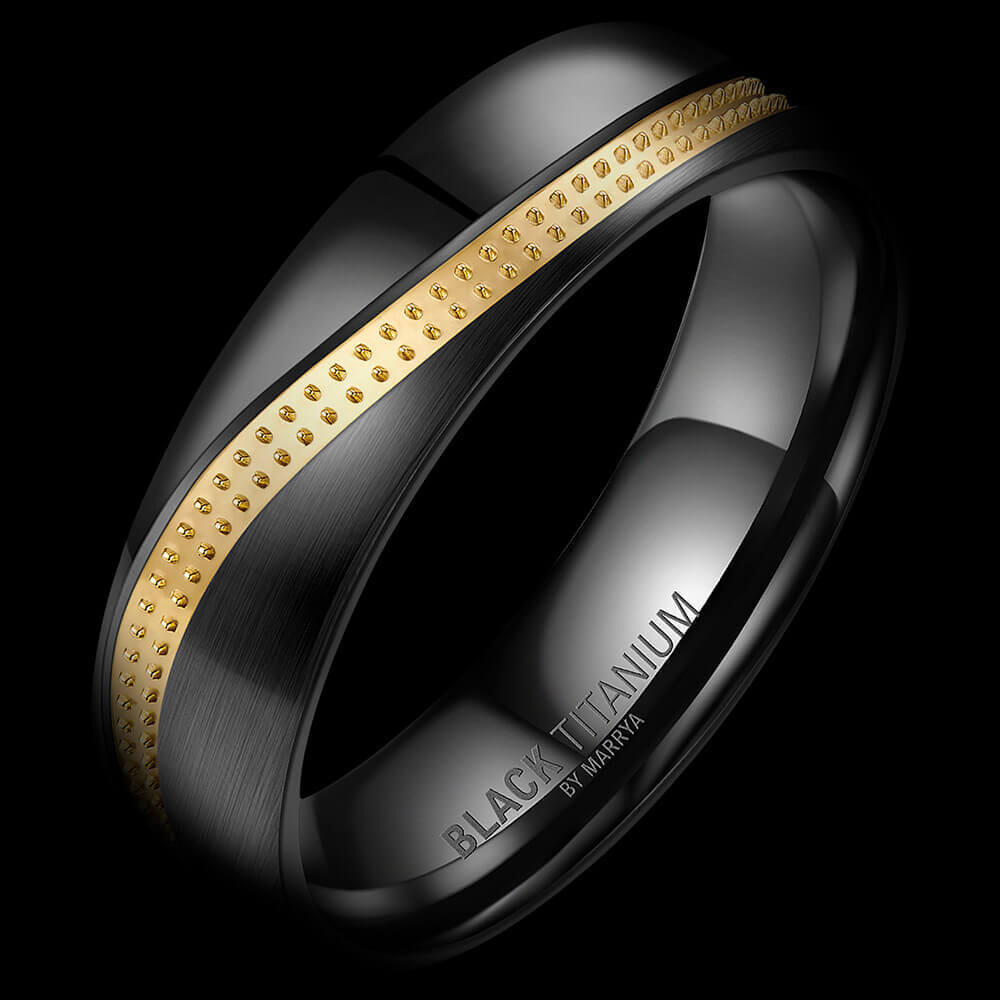 Ein schwarzer Herrenring aus Black Titanium. Eine Kombination aus 49% Titan und 51% Zirkonium vereint zu einem ganz besonderen Materialgemisch. Dieser 6mm breite und ca. 1,7mm starke Ring ist tiefschwarz, teilweise längsmatt in Kombination mit feiner goldener Beschichtung in einer Fuge im Wellendesign! Für angenehmen Tragekomfort sind die Ringe innen bombiert (abgerundet).
