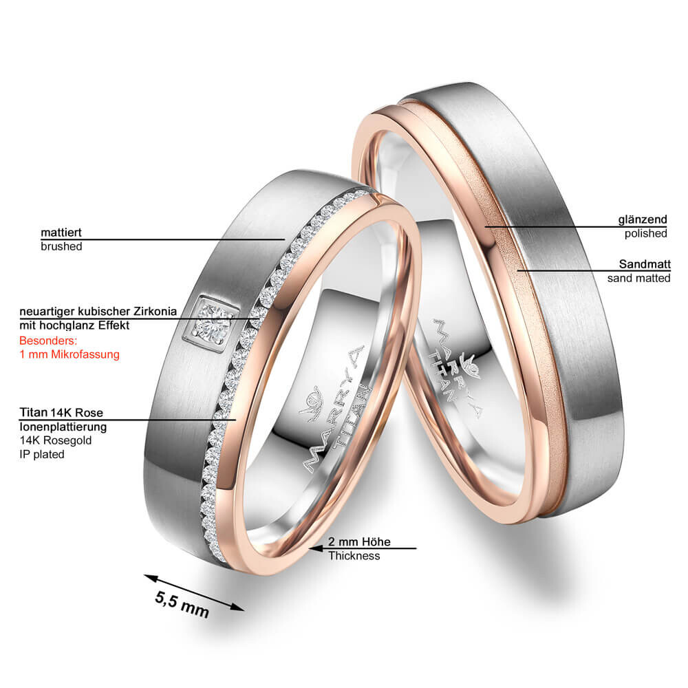 Dieser in 14K Roségold Ionenplattierung in hochglanz sowie Titan grau mattiert gehaltene Ring ist etwas ganz Beonderes. Die Fuge ist in sandmatt gehalten. Titan ist für seine vergleichsweise hohe Kratzfestigkeit und Stabilität bekannt, trotzdem ist es relativ leicht. Zusätzlich ist der Ring von innen abgerundet (bombiert). Dies sorgt für ein besonders angenehmes Tragegefühl am Finger.