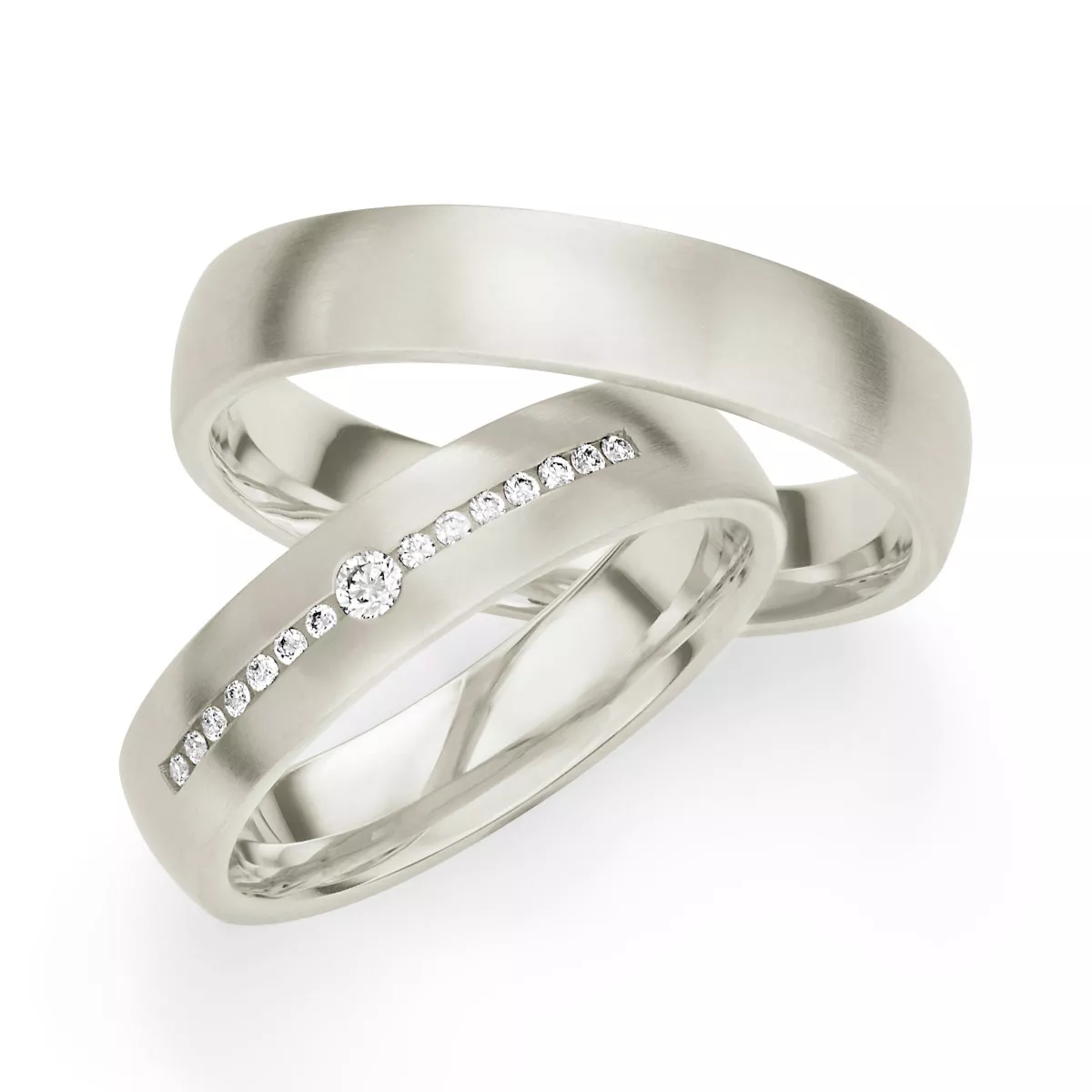 Hochwertige, ca. 4,5 mm breite Trauringe von Max Kemper aus längsmattiertem 950er Platin. Der Damenring ist mit mehreren strahlenden Brillanten veredelt. Für einen optimalen Tragekomfort sind die Ringe innen bombiert (abgerundet).