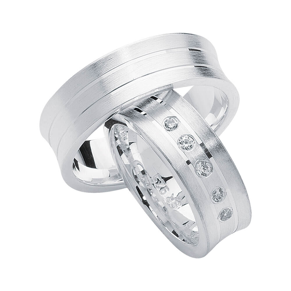 Wunderschöne ca. 7,0mm breite Partnerringe aus 925er Silber mit mattierter Oberfläche im konkaven Design. Der Damenring ist mit mehreren eingeriebenen funkelnden Zirkonia veredelt. Ringe im eleganten Design mit zwei Fugen, außen und innen gerundet! Preiswerte Ringe aus der Heartbeat Kollektion – auch als Trauringe gerne getragen.
