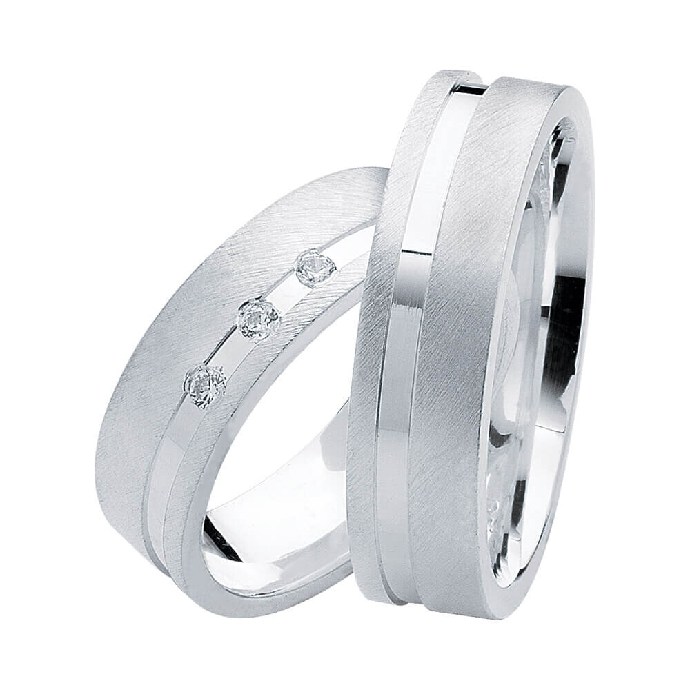Wunderschöne ca. 6,0mm breite Partnerringe aus 925er Silber mit quer mattierter Oberfläche und umlaufender glänzend polierter Fuge. Der Damenring ist mit mehreren eingeriebenen funkelnden Zirkonia innerhalb der Fuge veredelt. Ringe im eleganten Design, außen und innen gerundet! Preiswerte Ringe aus der Heartbeat Kollektion – auch als Trauringe gerne getragen.