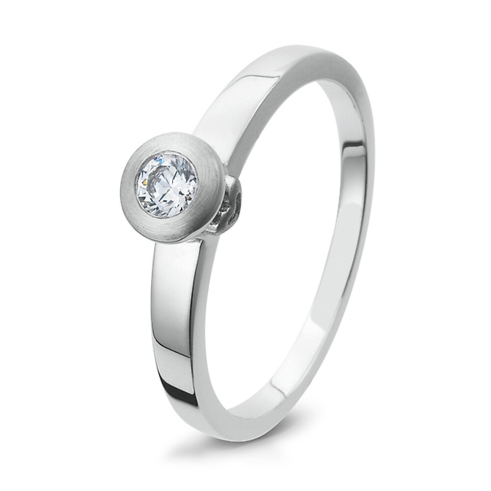 Ein faszinierender Ring aus 925er Silber mit einem Solitär sicher gefasst in einer Zargenfassung und seitlichem Besatz. Ein günstiger Silberring mit Zirkonia im modernen Look.
