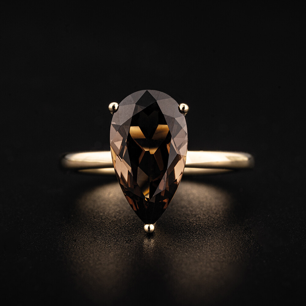 Dieses exklusive Schmuckstück vereint klassische Handwerkskunst mit zeitloser Eleganz. Der Ring besteht aus warmem Gelbgold und trägt in einer feinen Tropfenform (Tropfenform) einen tief schimmernden Rauchquarz. Die natürliche, rauchige Farbgebung des Steins verleiht dem Ring eine edle, zurückhaltende Ausstrahlung und macht ihn zum Blickfang zu jeder Gelegenheit.