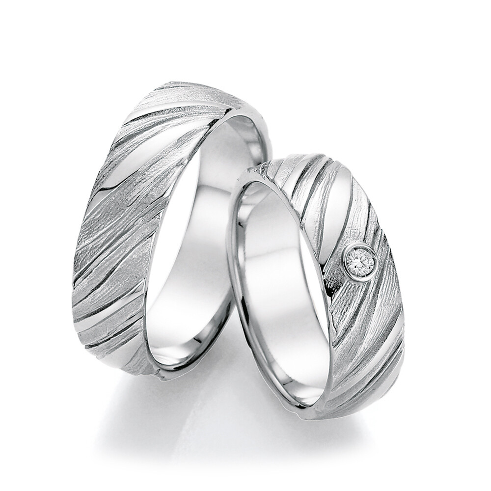 Anmutige Trauringe aus modernem Weißgold. Der Damenring besitzt einen faszinierenden eingeriebenen Brillanten mit 0,04 Karat w/si bezaubert er doch wirklich jedes Herz. Das Besondere an diesen großartigen Ringen ist die phantastische Oberfläche mit Muster. Der Brillant kommt auf dieser Oberfläche eindrucksvoll zum Strahlen. Was für eine schöne Symbiose! Ringe so individuell wie eure Liebe.
