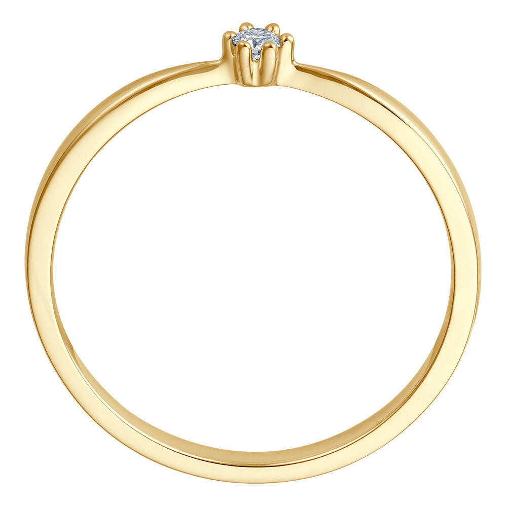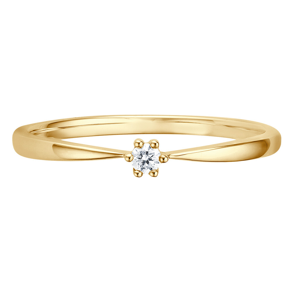 Ein atemberaubender, modischer Solitär-Ring im zarten Design. Der Ring ist aus warmen Gelbgold gefertigt und verleiht jedem Outfit einen Hauch von Eleganz und Glamour. Das Highlight dieses Rings ist der echte Diamant mit einem Gewicht von 0,040 ct. Der Diamant ist in einer 6er Krappe gefasst, die ihm einen sicheren Halt gibt und gleichzeitig seine Schönheit betont. Der funkelnde Diamant in der Farbe W (weiß) und der Reinheit SI (kleine Einschlüsse) sorgt für ein strahlendes Funkeln und macht diesen Ring zu einem wahren Blickfang. Die zarte und filigrane Gestaltung des Rings verleiht ihm eine zeitlose Schönheit, die nie aus der Mode kommt. Egal ob als Verlobungsring, Geschenk für einen besonderen Anlass oder als luxuriöses Accessoire für den Alltag - dieser Ring ist immer die perfekte Wahl.