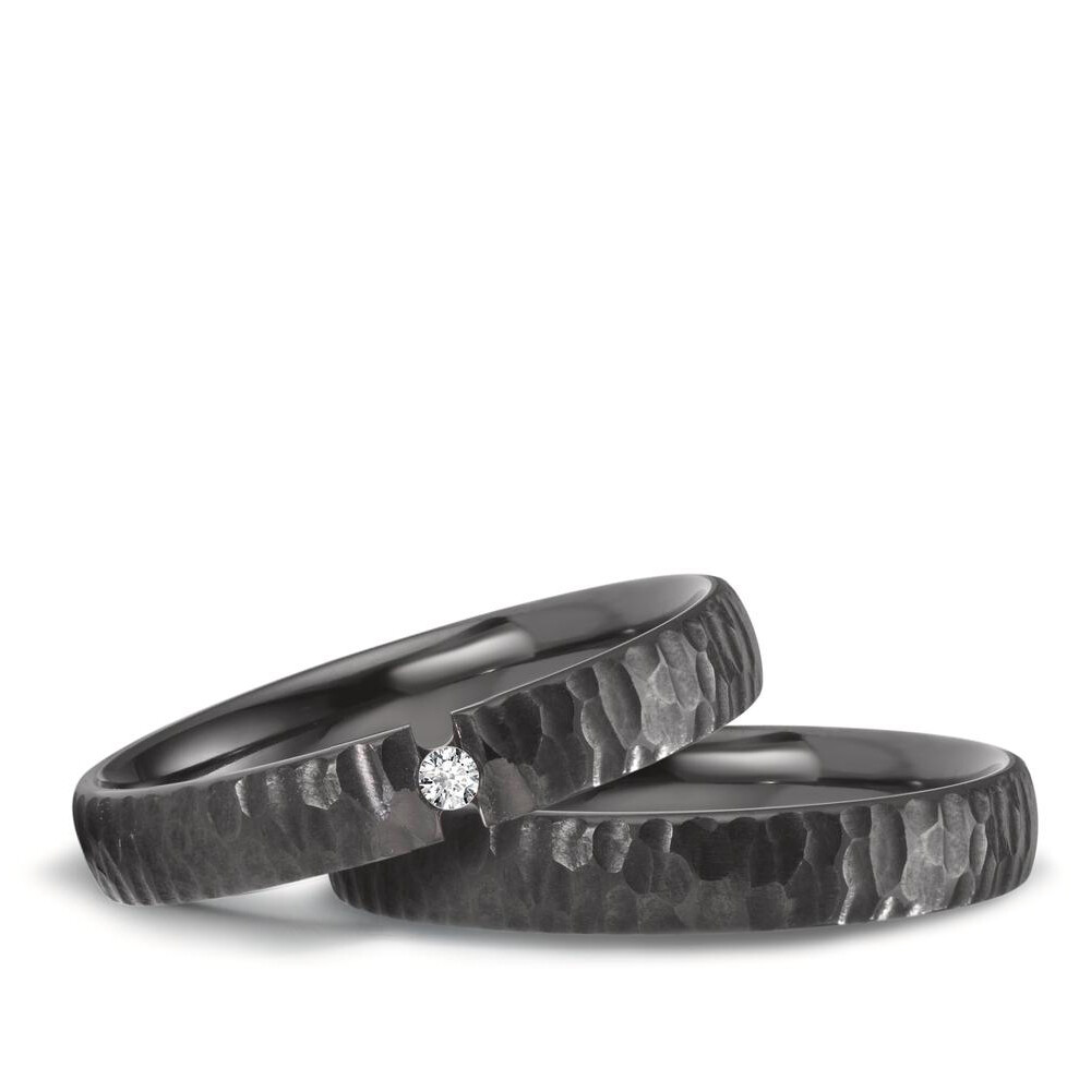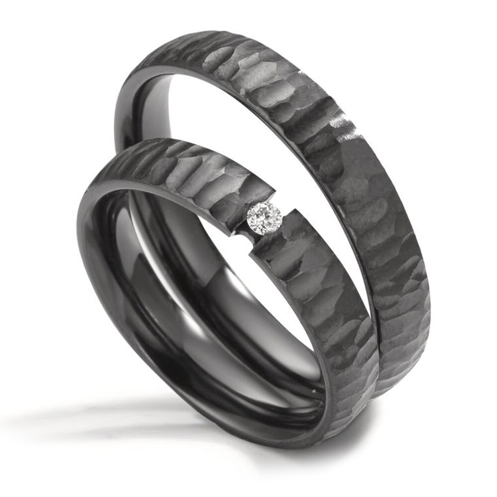 Faszinierende Ringe aus Zirkonium im modernen Design. Schwarze Eheringe mit strukturierter Oberfläche und einem strahlenden Brillanten am Damenring in Spannringoptik. Beide Ringe sind Made in Germany und sind innen wie außen leicht bombiert. Die Ringbreite ist mit nur 4 mm angenehm zu tragen.