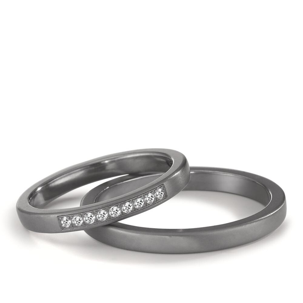 Moderne, besonders schmale Trauringe aus 999 Tantal mit mattierter Oberfläche. Der Damenring ist dabei mit 9 funkelnden Diamanten (ges. 0,090 ct. w/si) besetzt. Beide Ringe, welche auch als Partnerringe getragen werden können, sind Made in Germany und aus dem sehr seltenen Material Tantal gefertigt, welches zudem äußerst unempfindlich gegenüber Tragespuren ist. Gern gravieren wir diese Ringe mit Ihrem Wunschtext. Das Ringprofil ist gerade gerundet.