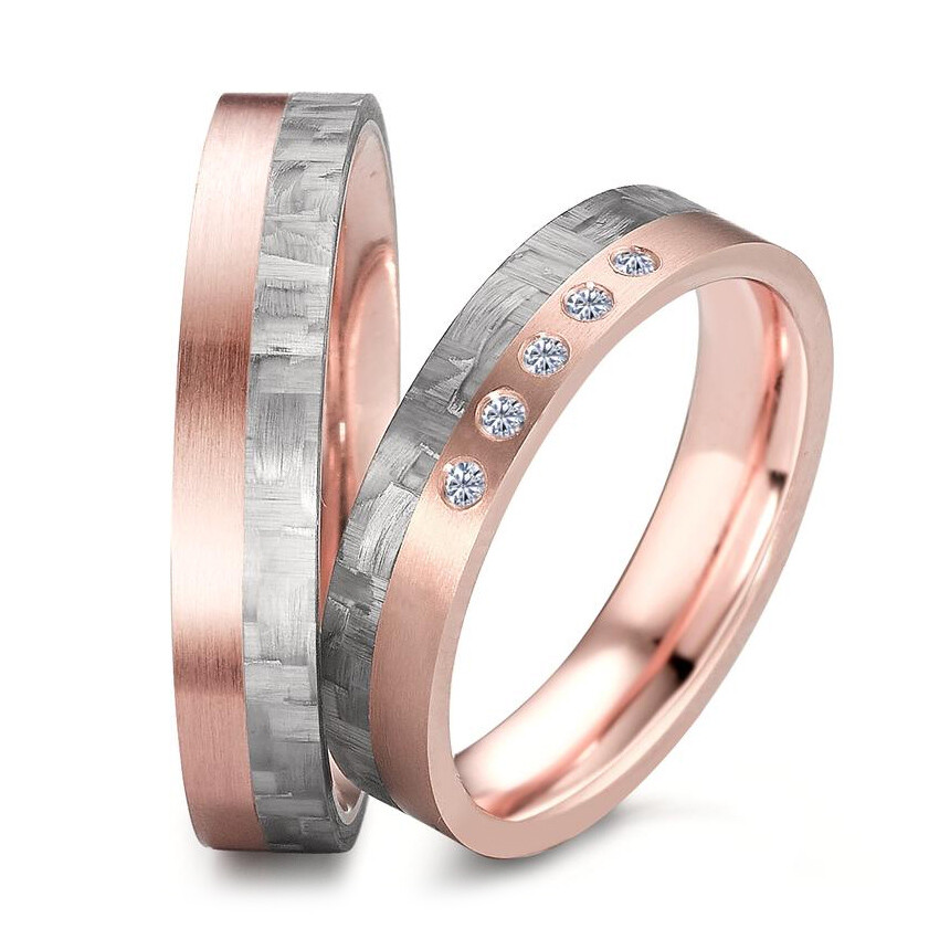 Wunderschöne Trauringe aus Carbon in grau im Zusammenspiel mit 585er Rotgold und mehreren strahlenden Diamanten am Damenring. Beide Ringe sind außen und innen leicht bombiert - für einen optimalen Tragekomfort.