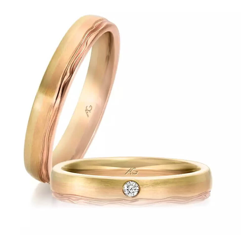 Traumhaft schöne Trauringe in 4mm Breite mit toller Oberfläche aus der exklusiven Morgenröte-Kollektion. Mit einem strahlenden Brillanten am Damenring. Der Farbverlauf von Rot über Mittelgold zu Gelbgold ist einfach faszinierend und macht diese Ringe zu etwas ganz Besonderen. Für einen optimalen Tragekomfort sind die Ringe innen bombiert (abgerundet).