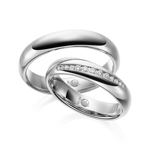 Paar Trauringe / Eheringe von Rubin Außen stark, innen leicht gerundet in Graugold 585/-. Steinbesatz mit zus. 0,14 ct. tw, si - feines weiß mit kleinen Einschlüssen.