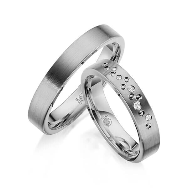 Paar Trauringe / Eheringe von Rubin Außen flach, innen leicht gerundet, gerade Kanten in Graugold 585/-. Steinbesatz mit zus. 0,041 ct. tw, si - feines weiß mit kleinen Einschlüssen.