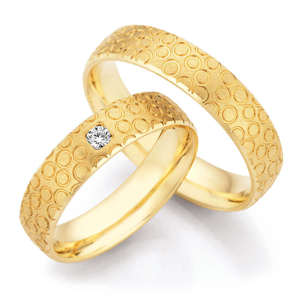 Wunderschöne Trauringe aus Gelbgold aus der Kollektion Honeymoon Solid XX mit mattierter Oberfläche und faszinierendem Fugendesign. Dieses Ringpaar mit einem funkelnden Brillanten am Damenring ist für einen angenehmen Tragekomfort bombiert (abgerundet).