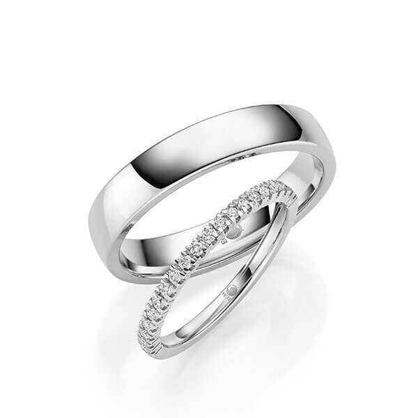 Paar Trauringe / Eheringe von Rubin Außen und innen leicht gerundet, gerade Kanten in Graugold dunkel 375/-. Steinbesatz mit zus. 0,2 ct. tw, si - feines weiß mit kleinen Einschlüssen.