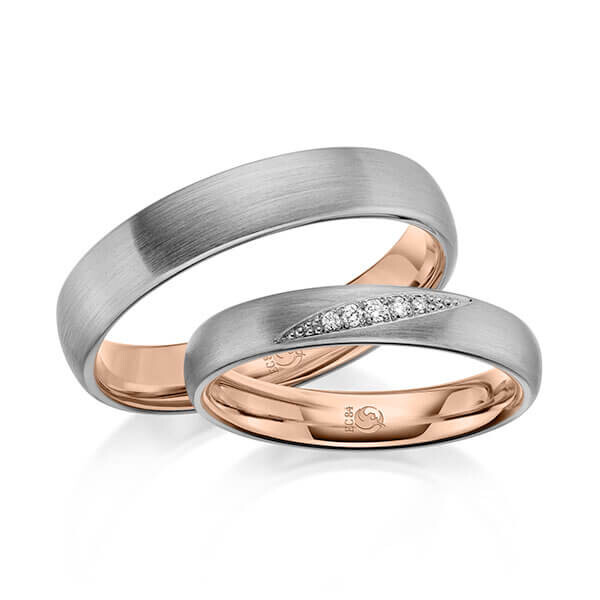 Paar Trauringe / Eheringe von Rubin Außen und innen gerundet in Innen Rotgold 585/- , außen Graugold 585/-. Steinbesatz mit zus. 0,036 ct. tw, si - feines weiß mit kleinen Einschlüssen.