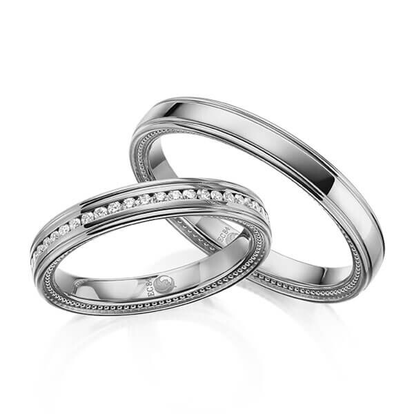 Paar Trauringe / Eheringe von Rubin Außen leicht gerundet, innen v-förmig in Palladium 585/-. Steinbesatz mit zus. ca. 0,192 ct. tw, si - feines weiß mit kleinen Einschlüssen.