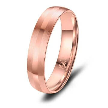 Wunderschöne Trauringe / Partnerringe aus Edelstahl mit erstklassiger 14K Rosé-Beschichtung. Das Modell ES-28 ist längs mattiert. Der Herrenring ist mit einem mittig angesetzten polierten Band verziert. Der Damenring ist an umlaufend mit mehreren 5A-Zirkonia mit Hochglanzeffekt veredelt, diese werden in einer Kanalfassung sicher gehalten. Durch ihre leichte Bombierung (an der Ringinnenseite abgerundet) sitzen die Ringe sehr bequem am Finger.
