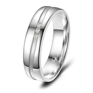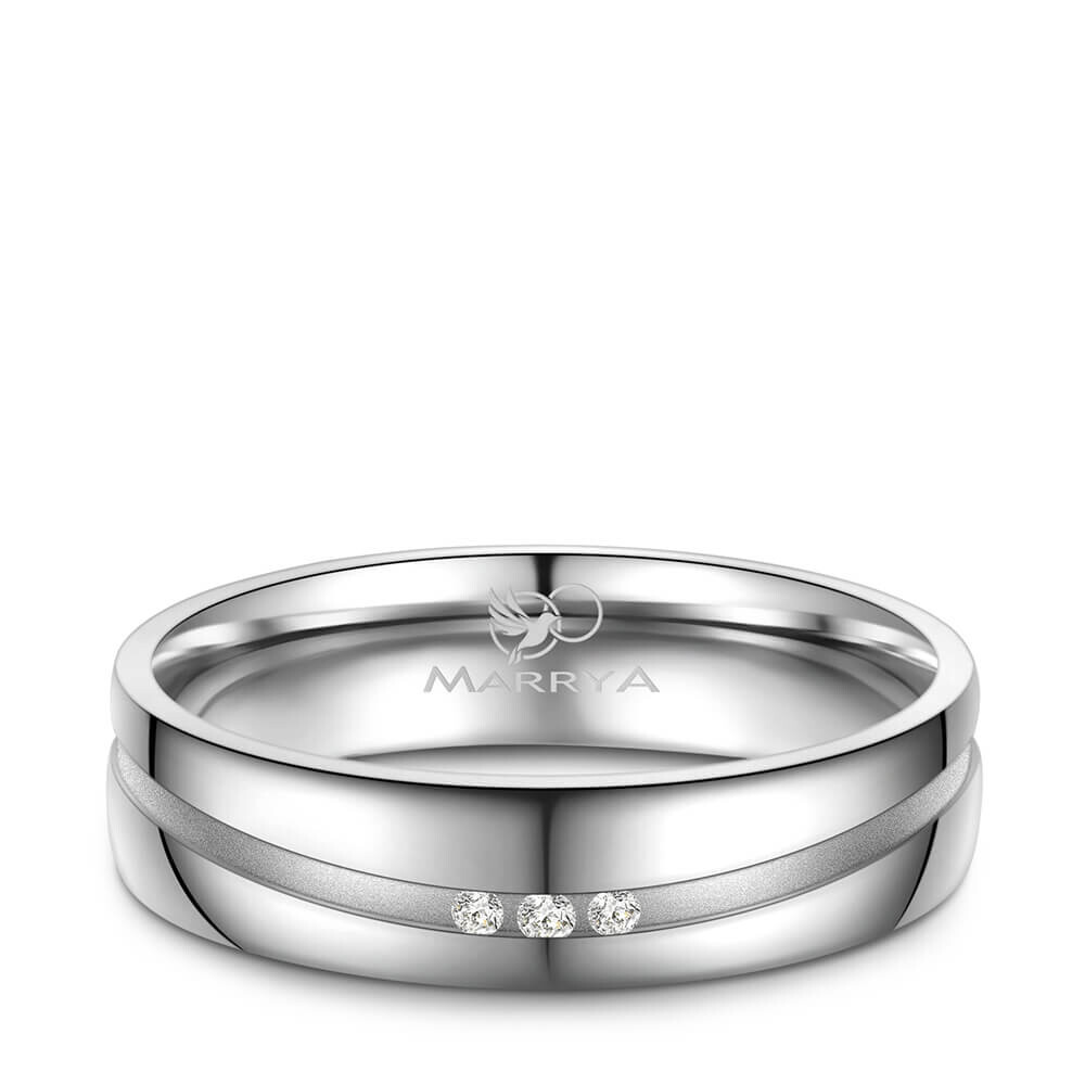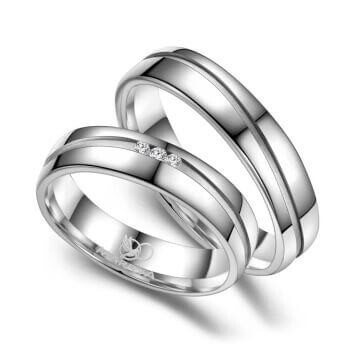 Trauringe / Partnerringe und Verlobungsringe aus mehrfach rhodiniertem 925er Sterlingsilber mit drei Zirkonia in Kanalfassung. Diese Silberringe mit qualitativ hohem Anlaufschutz sind hochwertig verarbeitet und sitzen durch ihre Bombierung (an der Ringinnenseite abgerundet) sehr bequem am Finger.
