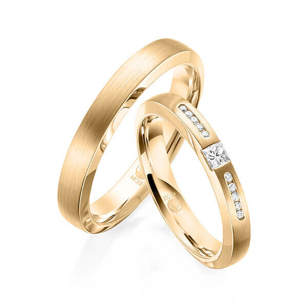 Paar Trauringe / Eheringe von Rubin außen leicht bombiert mit Glanz-Kanten 20 Grad in Roségold 375/-. Steinbesatz mit zus. 0,17 ct. tw, si - feines weiß mit kleinen Einschlüssen.