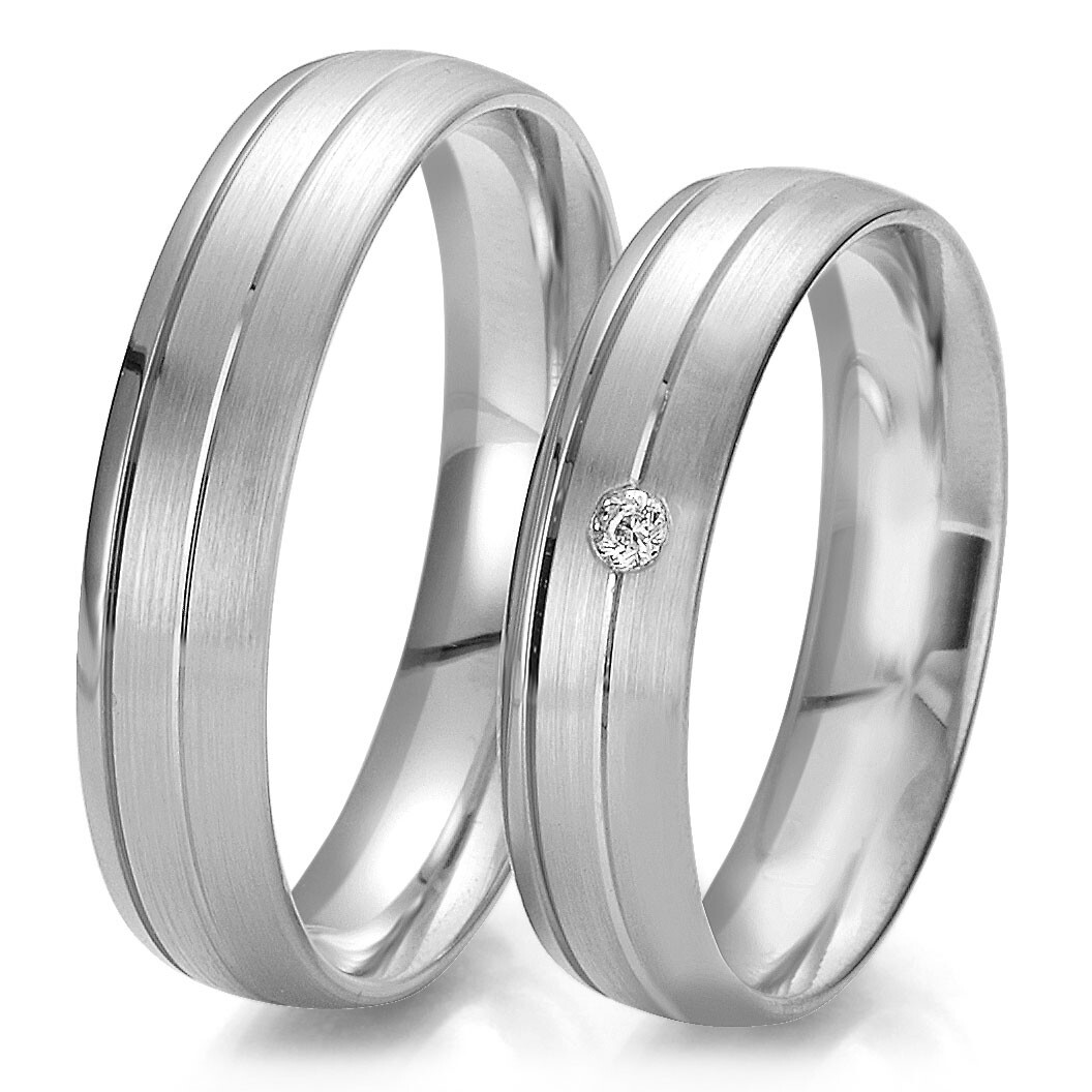 Einzigarige Trauringe aus Weißgold. Der Damenring ist mit einem strahenden Diamaten veredelt. Beide Ringe sind bombiert, für angenehmen Tragekomfort.