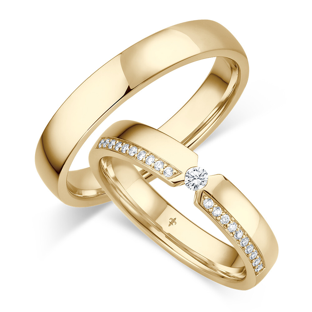 Faszinierende Trauringe Sofia aus Gelbgold von der Manufaktur Giloy mit polierter Oberfläche. Der Damenring ist mit mehreren strahlenden Diamanten im Brillantschliff veredelt. Beide Ringe sind bombiert, für angenehmen Tragekomfort.