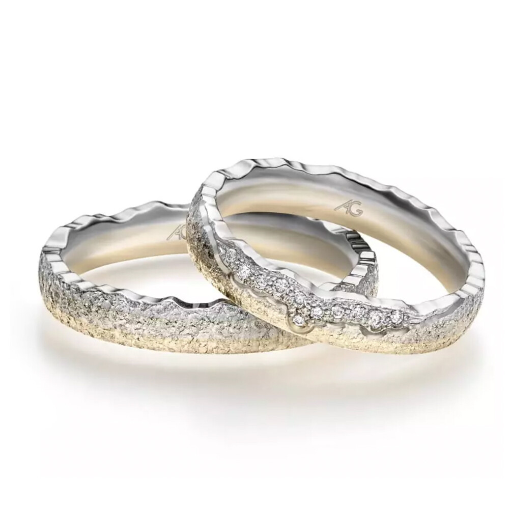 Traumhafte Trauringe aus der exklusiven Sonnenlicht-Kollektion von August Gerstner. Mit mehreren funkelnden Diamanten am Damenring. Der Goldverlauf von Weiß nach Gelb ist einfach faszinierend. Für einen optimalen Tragekomfort sind die Ringe innen bombiert (abgerundet).