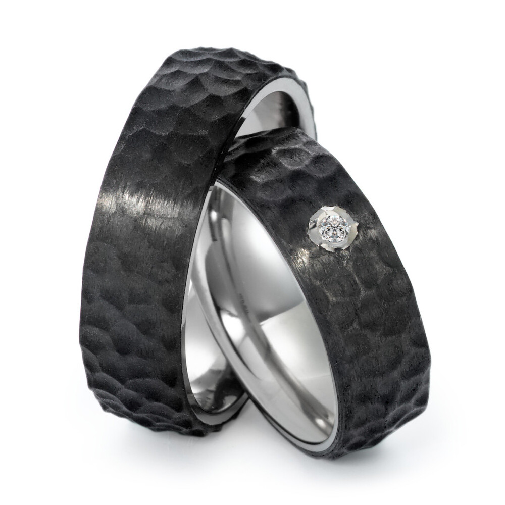 Spezielle Trauringe aus Titan und Carbon - so stark, wie eure Liebe! Für alle die das Außergewöhnliche lieben sind diese fantastischen Ringe das Richtige: Ein Brillant mit 0,03 Carat in Schmuckqualität w/si verziert den Damenring und lässt ihn strahlen. Die gehämmerte Oberfläche fällt bei diesen super schönen Ringen ganz besonders ins Auge!