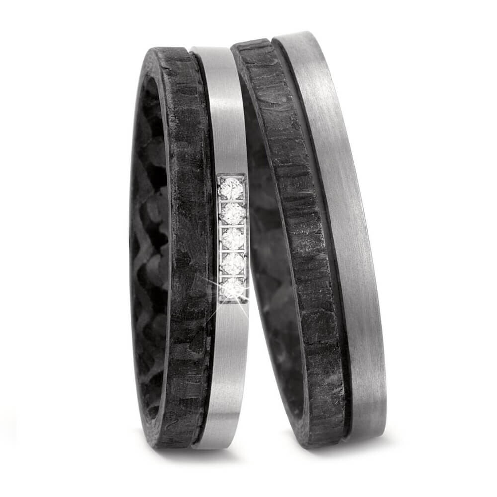 Spezielle Trauringe aus Titan und Carbon - so stark, wie eure Liebe! Für alle die das Außergewöhnliche lieben sind diese fantastischen Ringe das Richtige: 5 Brillanten mit 0,05 Carat in Schmuckqualität w/si verzieren den Damenring und lassen ihn strahlen. Die Oberfläche fällt bei diesen super schönen Ringen ganz besonders ins Auge!