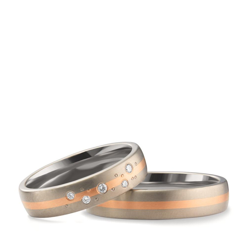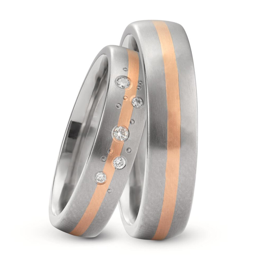Mattierte Trauringe aus Titan und 750er Rotgold und mehreren strahlenden Diamanten – einem Sternenhimmel gleich – am Damenring. Beide Ringe sind außen und innen leicht bombiert - für einen optimalen Tragekomfort.
