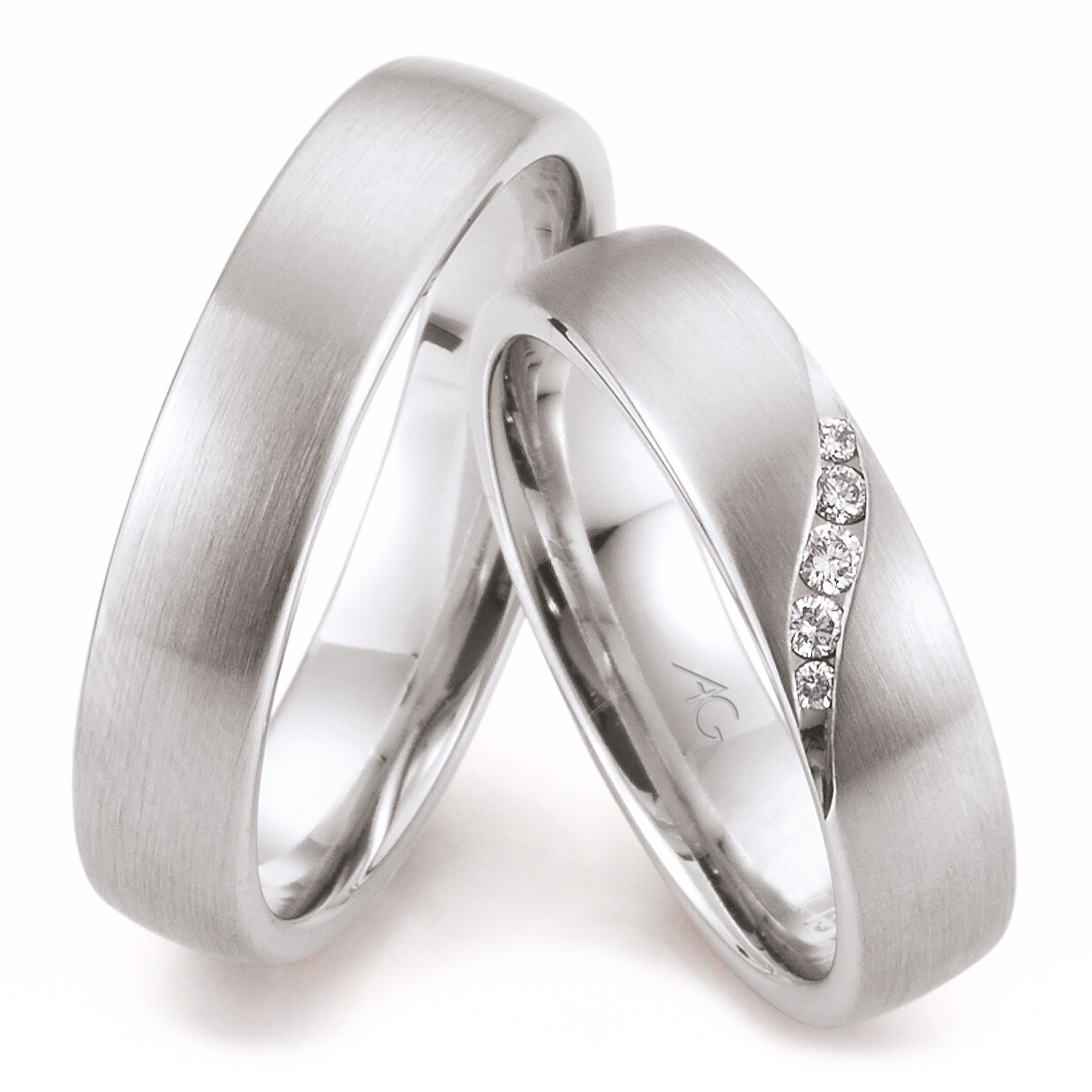 Klassisch elegante Trauringe von August Gerstner aus mattiertem Weißgold. Der Damenring ist mit mehreren quer über den Ring platzierten Diamanten veredelt. Für einen optimalen Tragekomfort sind die Ringe innen bombiert (abgerundet).