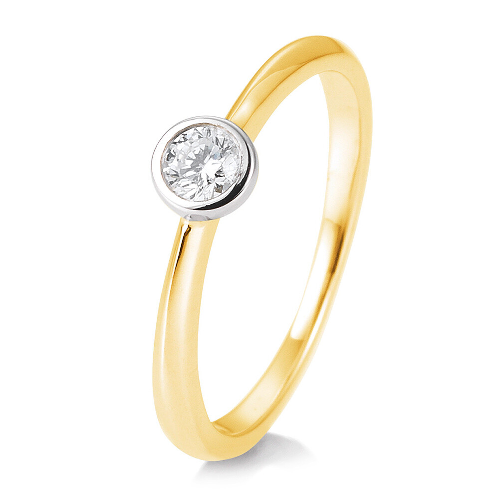 Ein wunderschöner Bicolor Verlobungsring aus feinem Weißgold / Gelbgold mit einem strahlenden Solitär gefasst in einer Zarge.