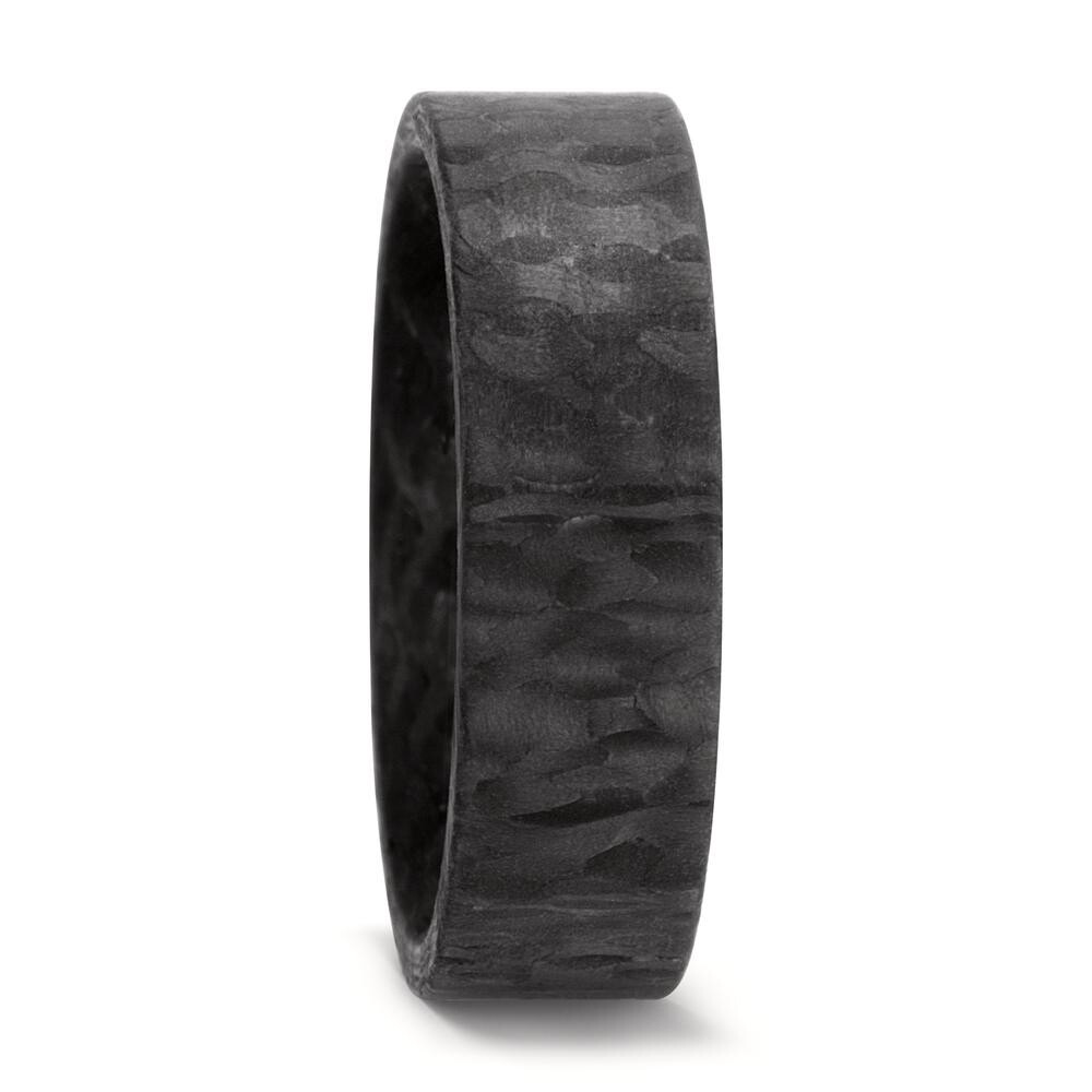 Wunderschöne strukturierte Verlobungsringe aus Carbon von TitanFactory. Der Damenring ist mit einem funkelnden Diamanten geschmückt. Beide Ringe sind außen gerade und innen bombiert.