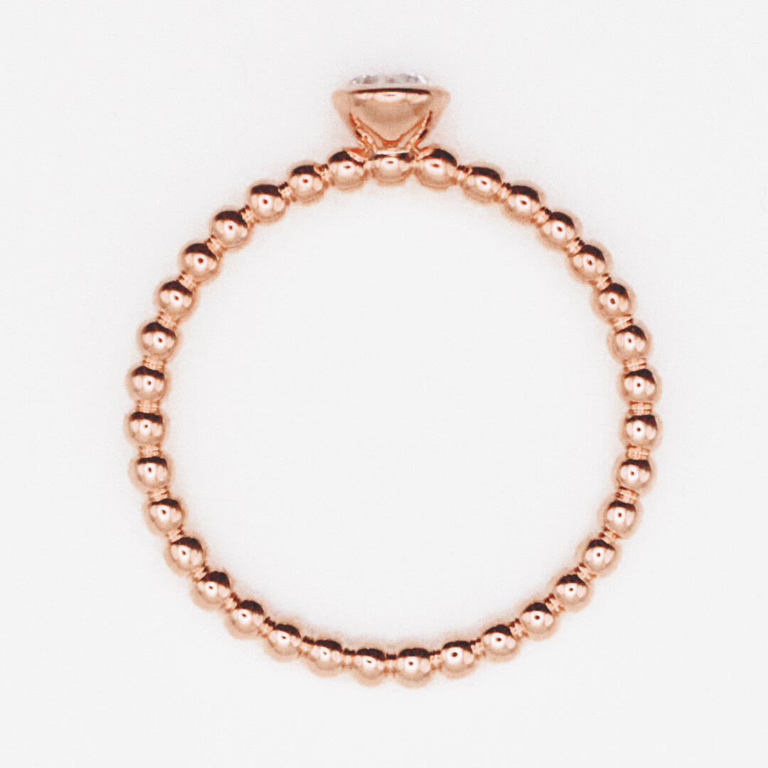 Ein wunderschöner und sehr zarter Kugelring aus Rotgold mit einem strahlenden Solitär in Zargenfassung. Dieser Perlenring von Breuning wird zusammen mit einem schönen Ring-Etui geliefert.