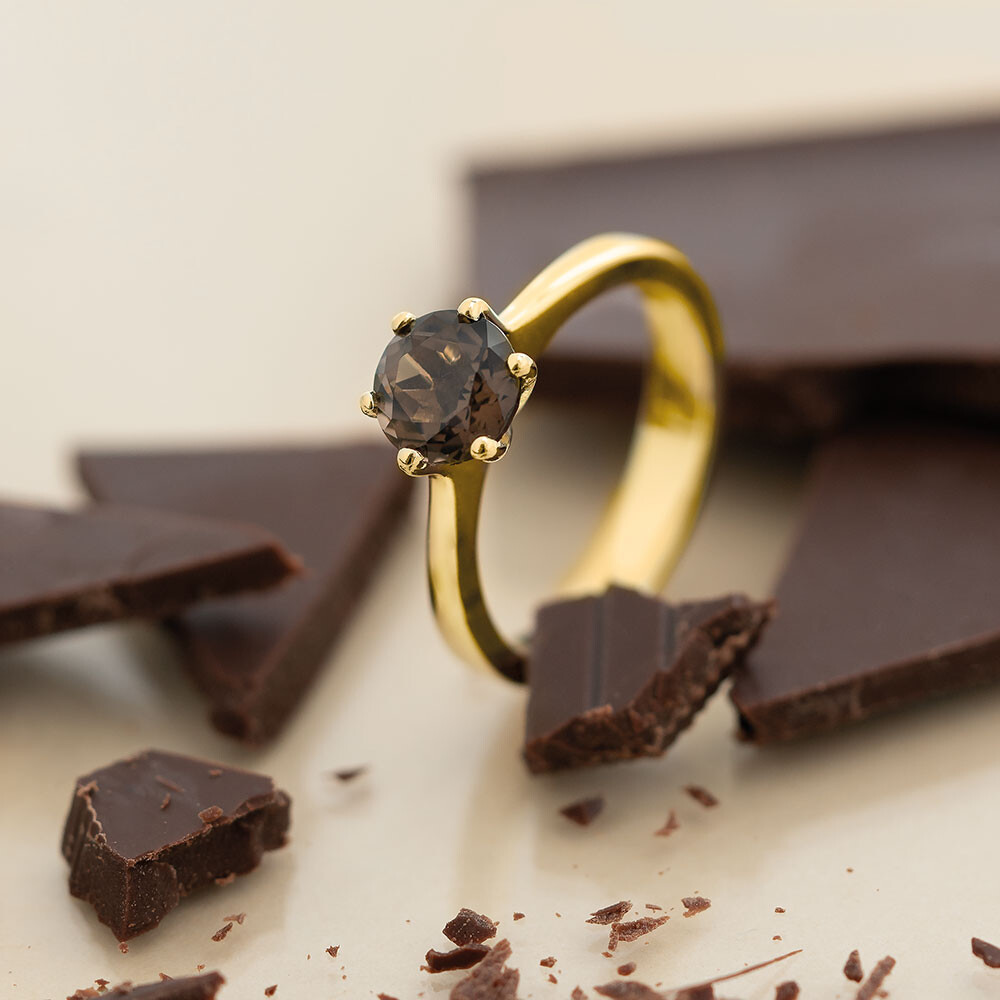 Dieser Verlobungsring vereint Gelbgold mit dem braunen Farb-Edelstein Rauchquarz. Ein faszinierende Kombination welche den Ringträger glücklich macht! Mit einer individuellen Innengravur wird dieser Ring zu etwas ganz persönlichem.
