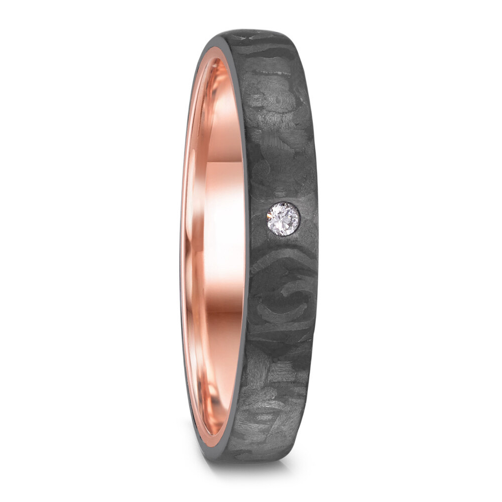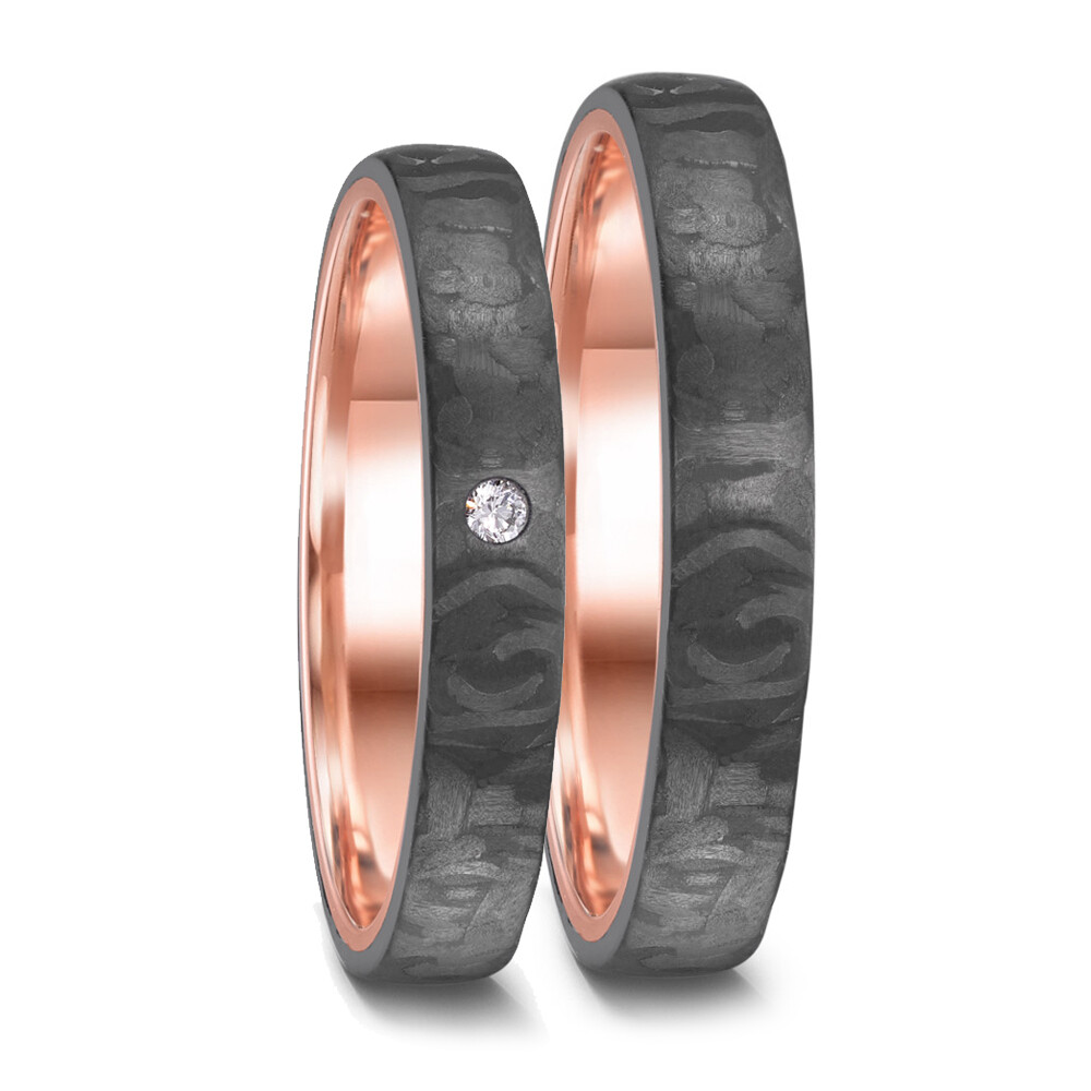 Sehr ausgefallene, schmale Eheringe oder Partnerringe aus 585er/14Kt Rotgold fest ummantelt mit schwarzem Carbon im schlichten und zeitlosen Design. Der Damenring ist mit einem funkelnden Brillanten veredelt welcher in Kombination mit dem dunklen Carbon besonders strahlt. Das Ringprofil ist innen und außen leicht bombiert, das sorgt für angenehmen Tragekomfort. Wunderschöne Ringe Made in Germany!